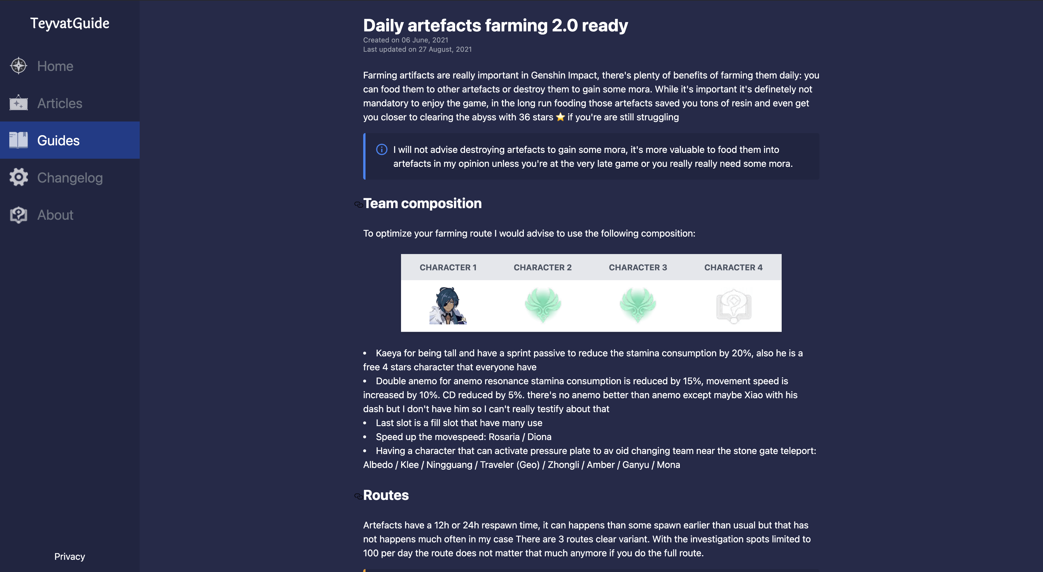 As a huge fan of the game Genshin Impact, I decided to create a website for that, where I wrote my guides and articles during my free time, it has been also an opportunity to try new technologies like gatsbyJS and tailwindcss